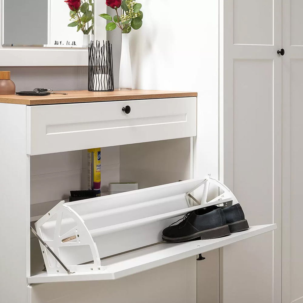 • Высокая и узкая тумба для обуви — благодаря выдвижным ящикам может служить одновременно комодом, что является удачным решением для небольших пространств.