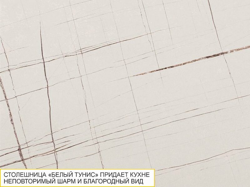 Столешница «Белый Тунис» гармонично сочетается с различными цветами фасадов и декоративными элементами, придавая кухне неповторимый шарм и благородный вид.