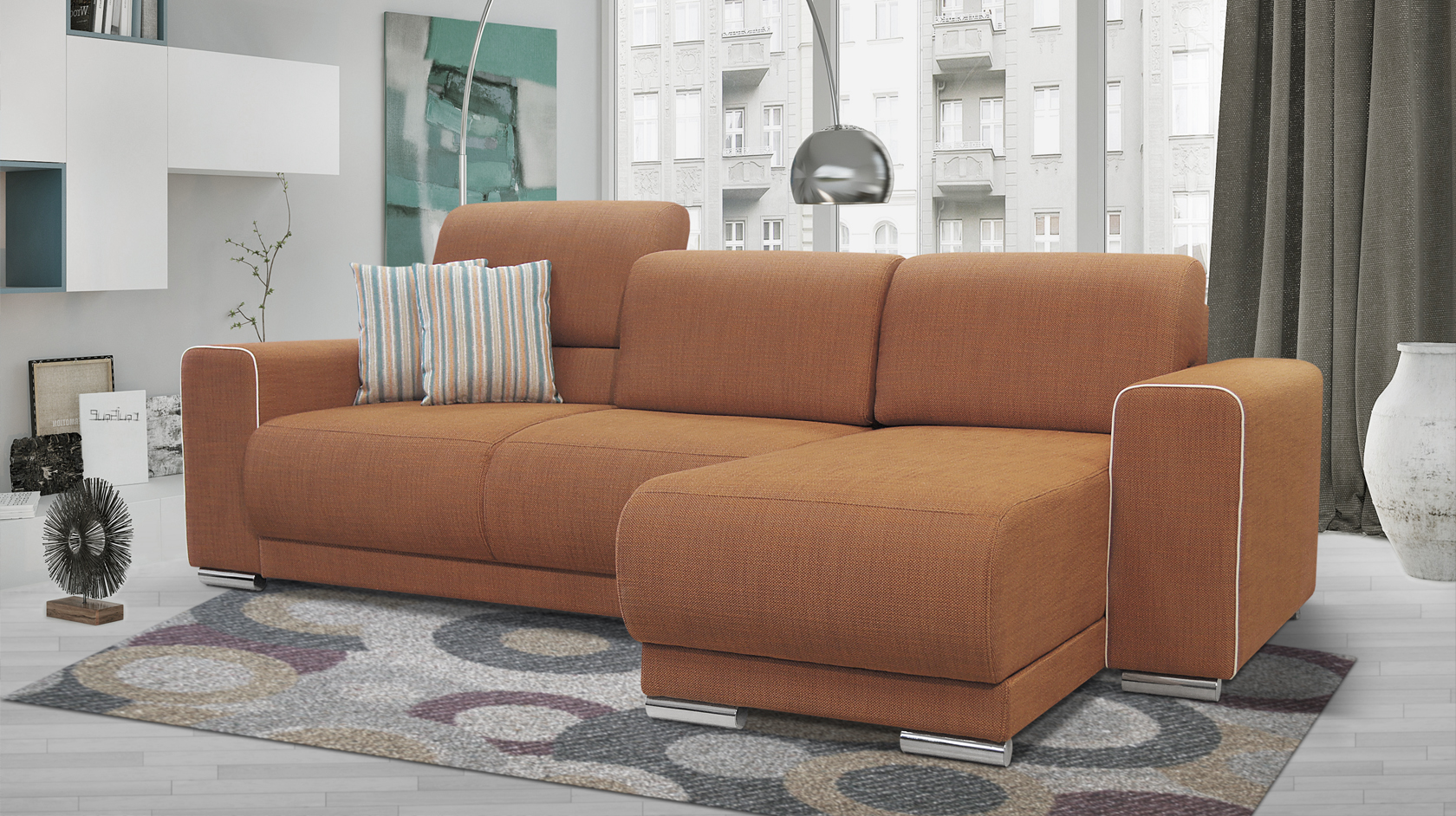Великолепный диван выполненный в современном американском стиле. Диваны оснащены коробом для белья, удобным механизмом раскладки и просторным спальным местом. Латексный ППУ отлично сохраняет форму и обеспечивает оптимальный уровень жесткости для комфортного сна. Подушки переставляются и регулируются по высоте для подбора более комфортного положения. Особенность конструкции – универсальный угол. Механизм раскладки: «тик-так».