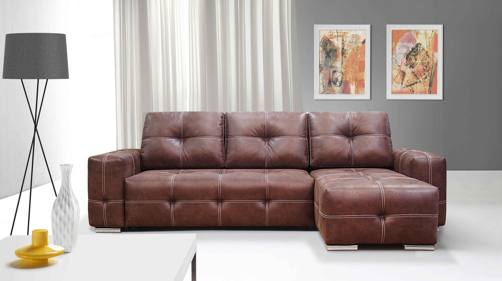 Диван Феликс — этой модели свойственны яркая индивидуальность и законченность во всем облике. Современный, практичный, надежный диван. Особенностью этой модели является строгая двойная декоративная строчка и пышные формы. Механизм трансформации предназначен для повседневного использования, образуя просторное спальное место. Подушки спинки наполнены высококачественным синтетическим пухом. Диван Феликс может быть выполнен в угловом варианте, в котором имеет универсальный угол и позволяет менять расположение оттоманки.