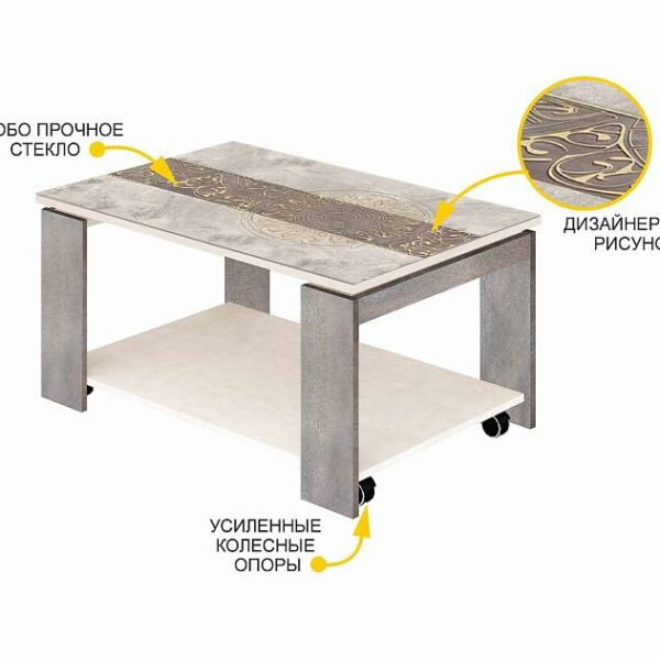 Усиленные поворотные колеса позволяют легко перемещать столик по комнате. Стопоры на колесах обеспечивают надежную фиксацию стола в нужном положении.