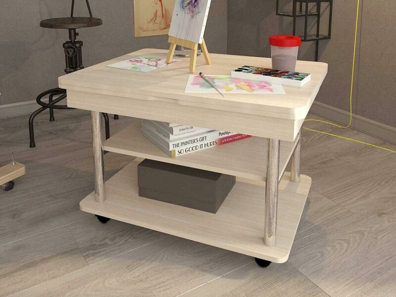 При помощи раскладного механизма журнальный столик легко превращается в обеденный или письменный стол и имеет четыре варианта трансформации.