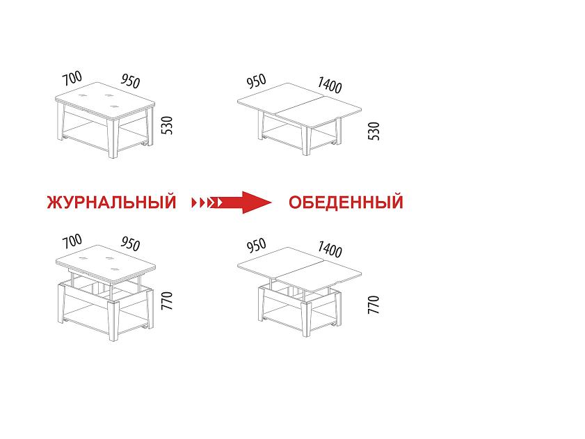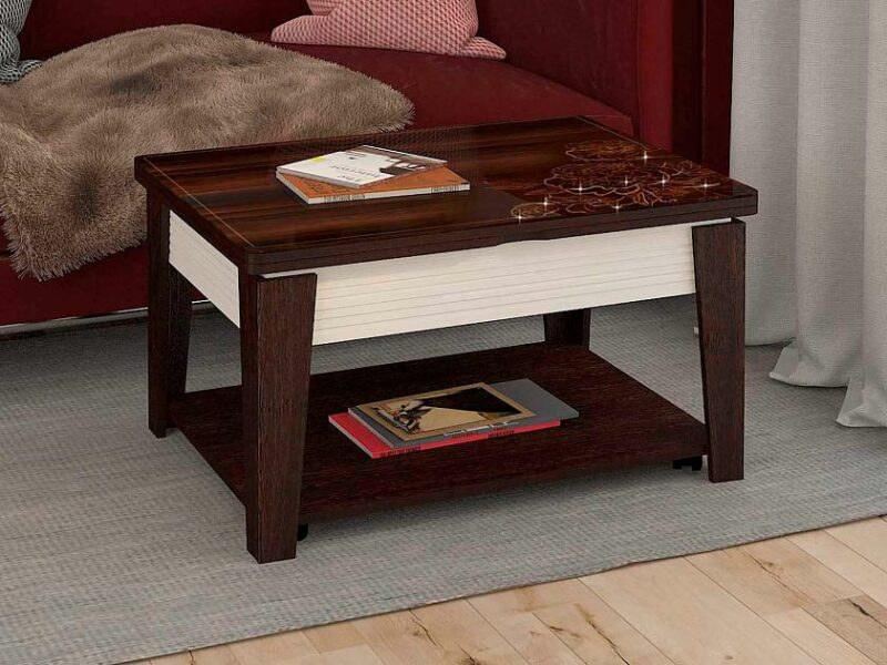 При помощи раскладного механизма журнальный столик легко превращается в обеденный или письменный стол. Модель имеет 4 варианта трансформации.