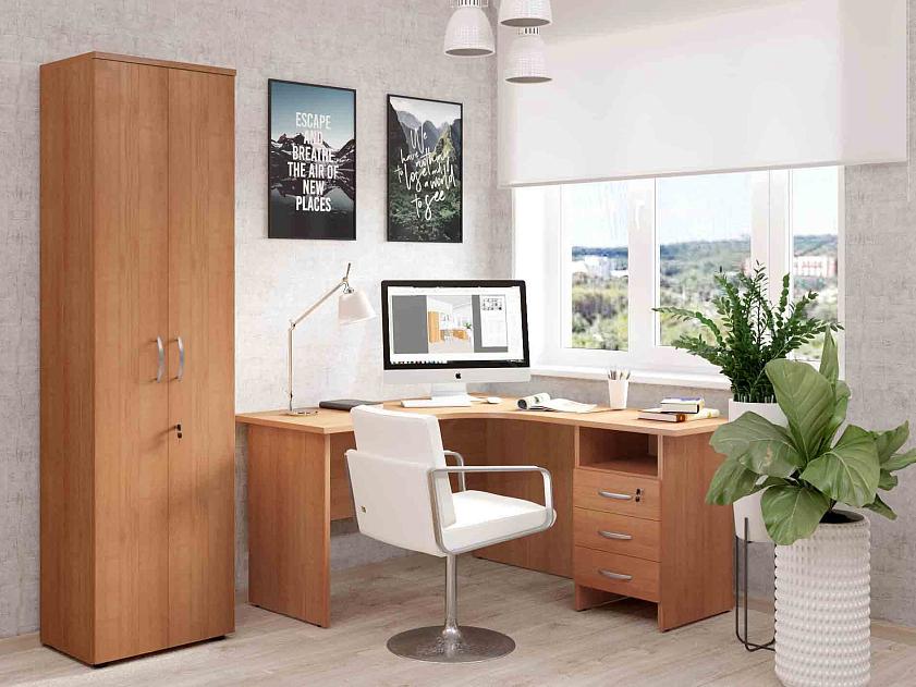 Набор мебели для офиса состоит из углового рабочего стола с тумбой и закрытого шкафа с полками.