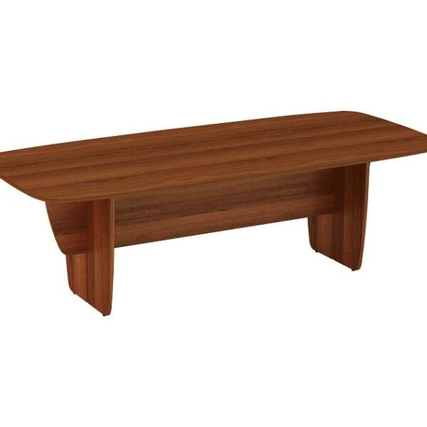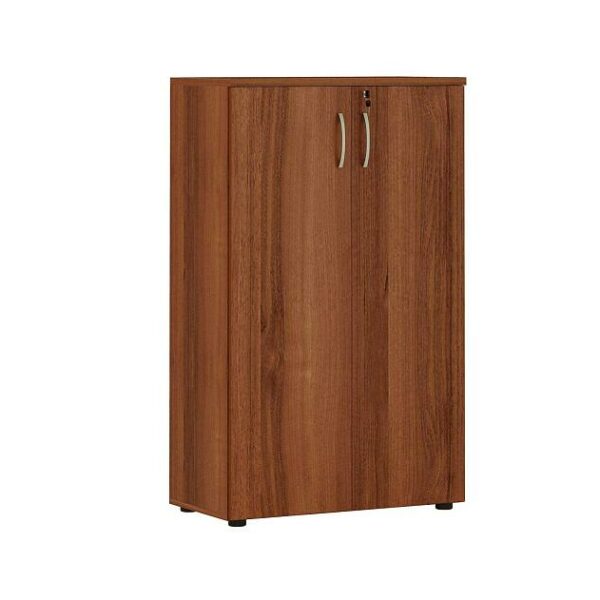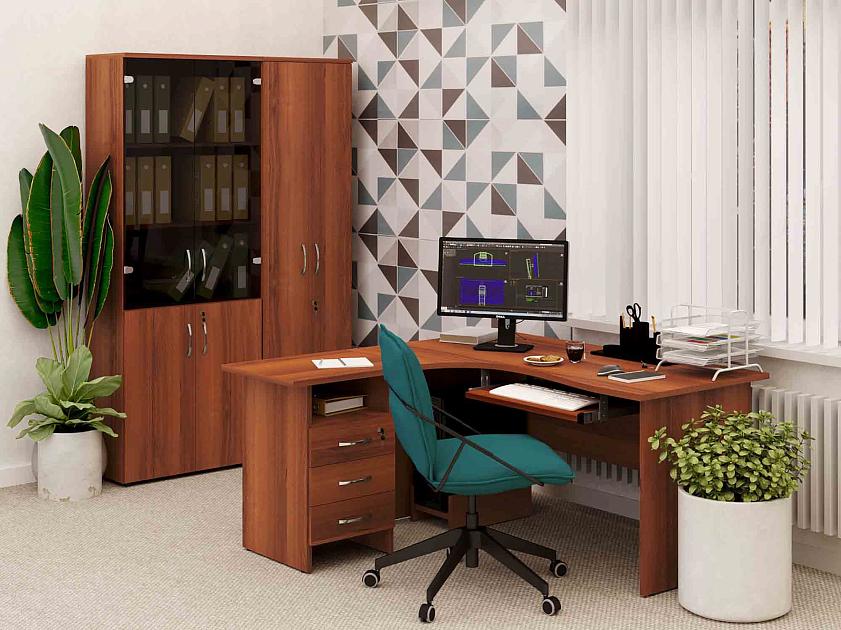 Набор мебели для офиса состоит из углового рабочего стола с выдвижной панелью и тумбой, шкафа и стеллажа для документов.