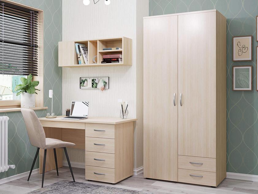 Набор мебели для офиса состоит из рабочего стола, навесной полки и шкафа для одежды с полками и штангой.