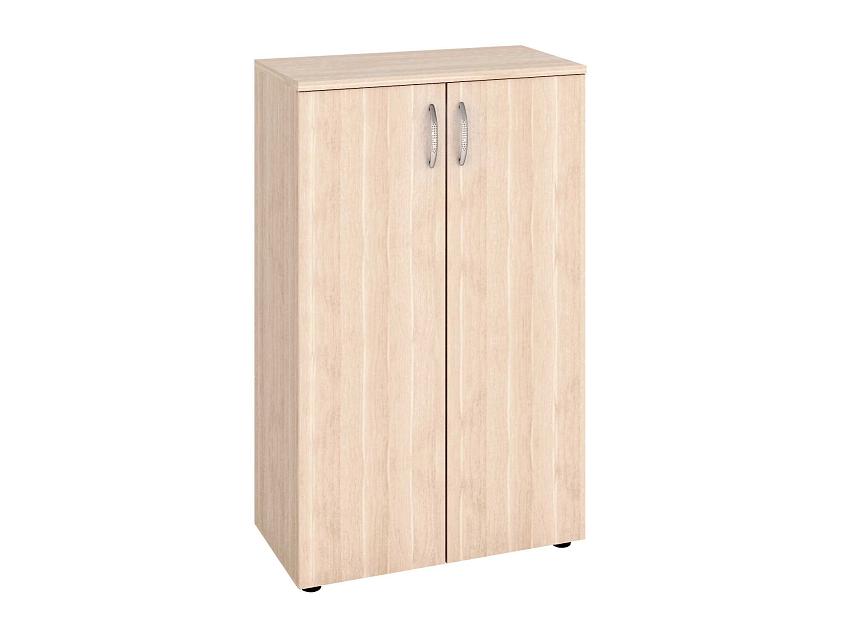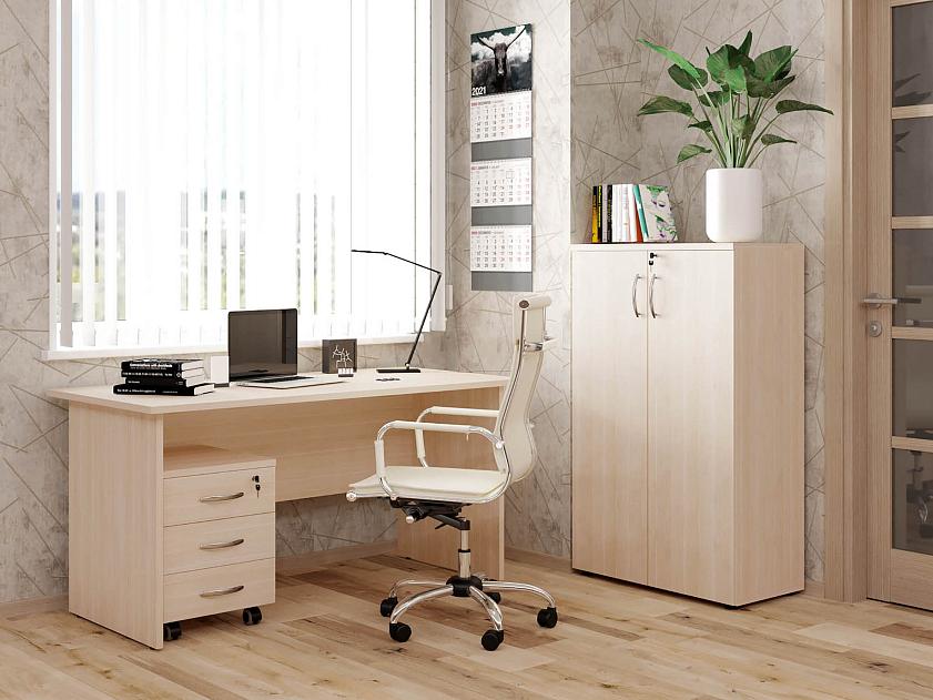 Набор мебели для офиса состоит из рабочего стола с выкатной тумбой и закрытого шкафа с полками.
