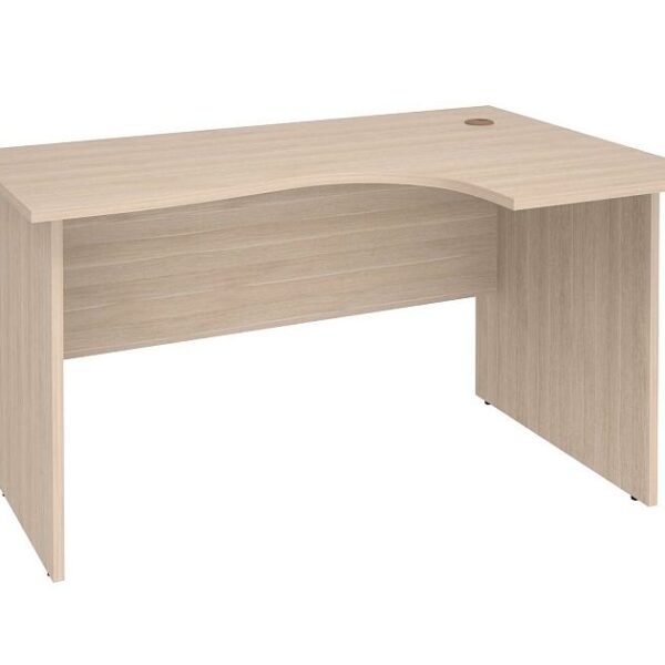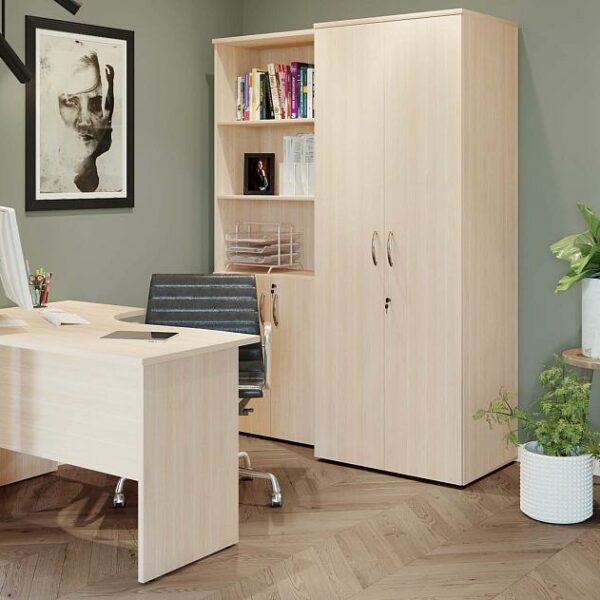 Набор мебели для офиса состоит из углового рабочего стола с выдвижной панелью и тумбой, шкафа и стеллажа для документов.