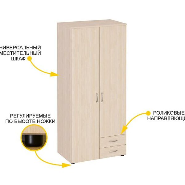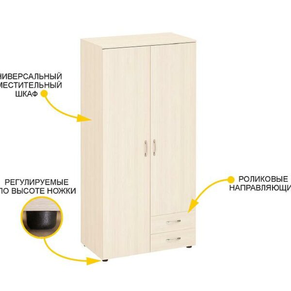Шкаф состоит из двух модулей, в состав которых входят секционные стяжки, позволяющие выровнять топы шкафов в одну линию и придать шкафной группе аккуратный законченный внешний вид.