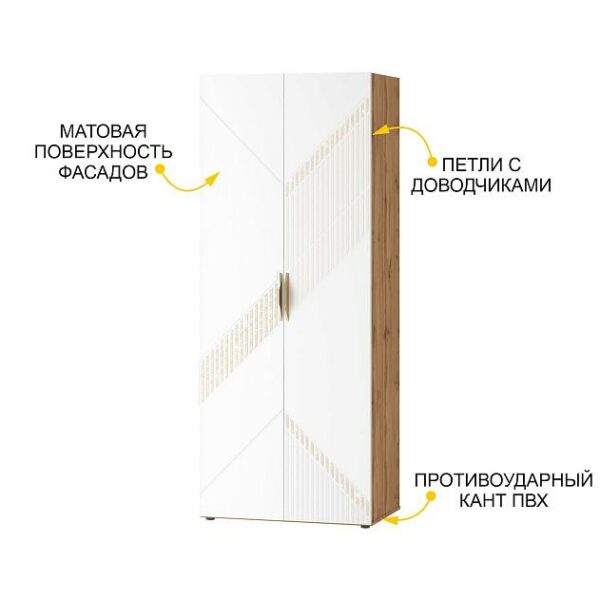 Мебель произведена из МДФ и ЛДСП повышенной плотности. Материал устойчив к механическим и термическим воздействиям. ЛДСП выдерживает min 300 циклов на истирание, что почти в 5 раз больше, чем требуется по ГОСТу (min 65).