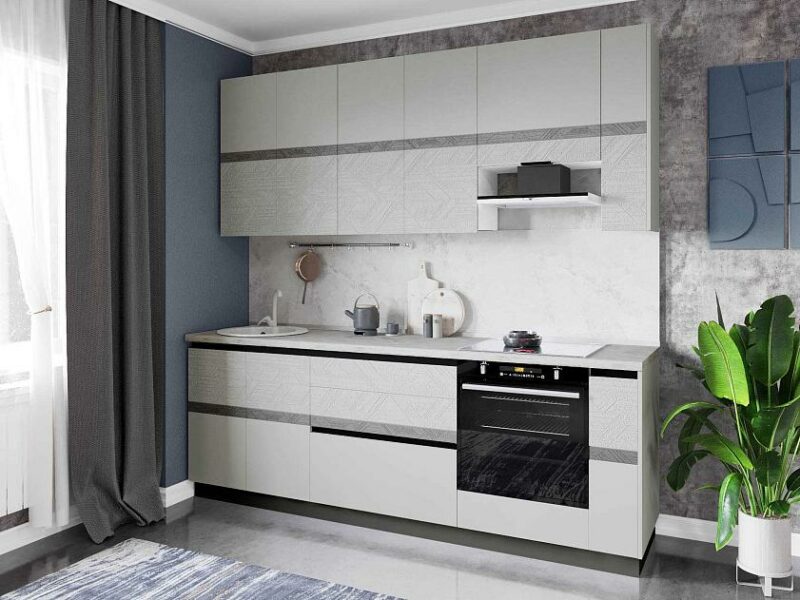 Объемное дизайнерское тиснение на фасадах подчеркивает современный стиль кухни.