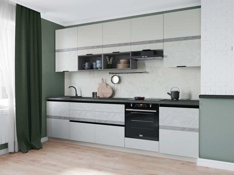 Объемное дизайнерское тиснение на фасадах подчеркивает современный стиль кухни.