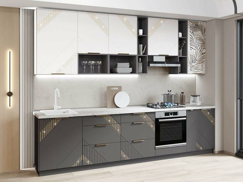 Нижние фасады выполнены в насыщенном цвете «Графит», который добавляет кухне глубины и контраста, подчеркивая элегантность дизайна.