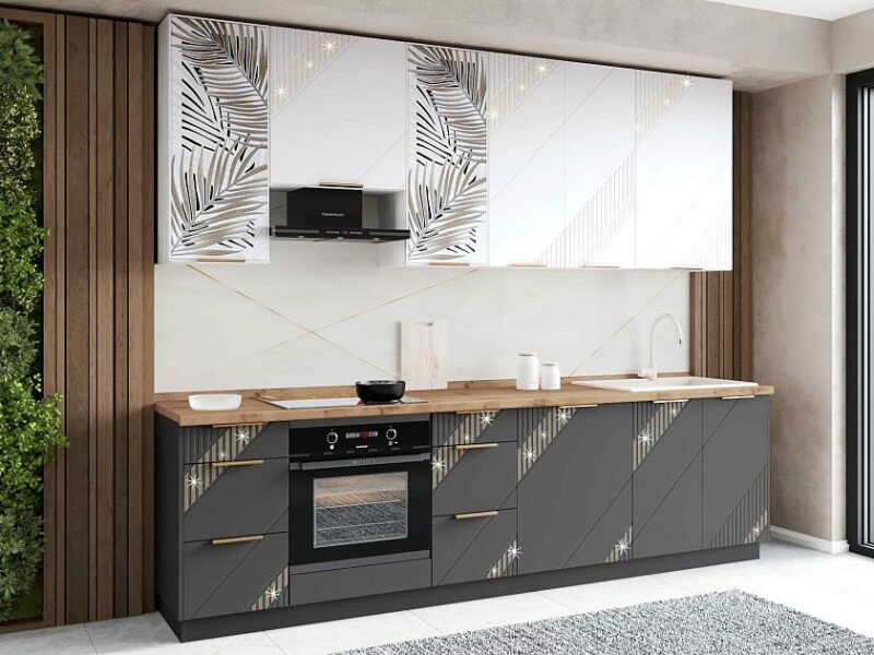 Кухня «Монако 106» — это образец элегантного стиля и утонченного вкуса. Эффектная фрезеровка с объемным 3D-рисунком и россыпью глиттера подчеркивает