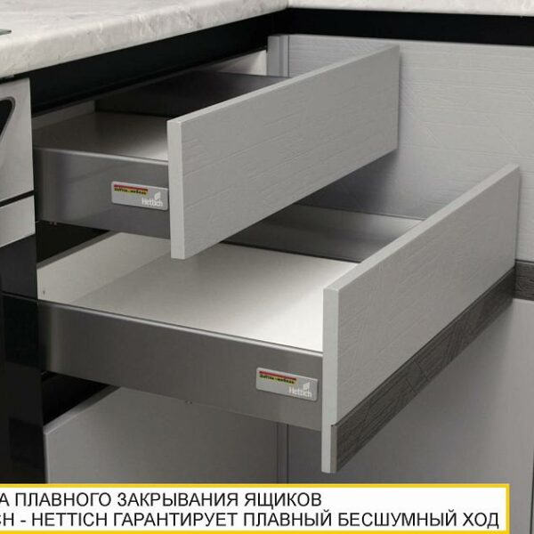 Европейская фурнитура обеспечивает удобную и длительную эксплуатацию. Ножки столов регулируются по высоте для удобной установки модулей и корректировки неровностей пола.