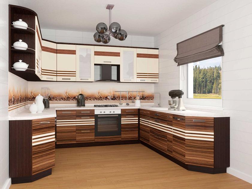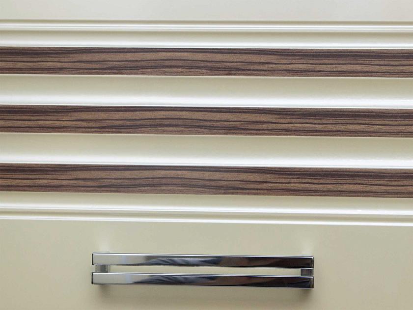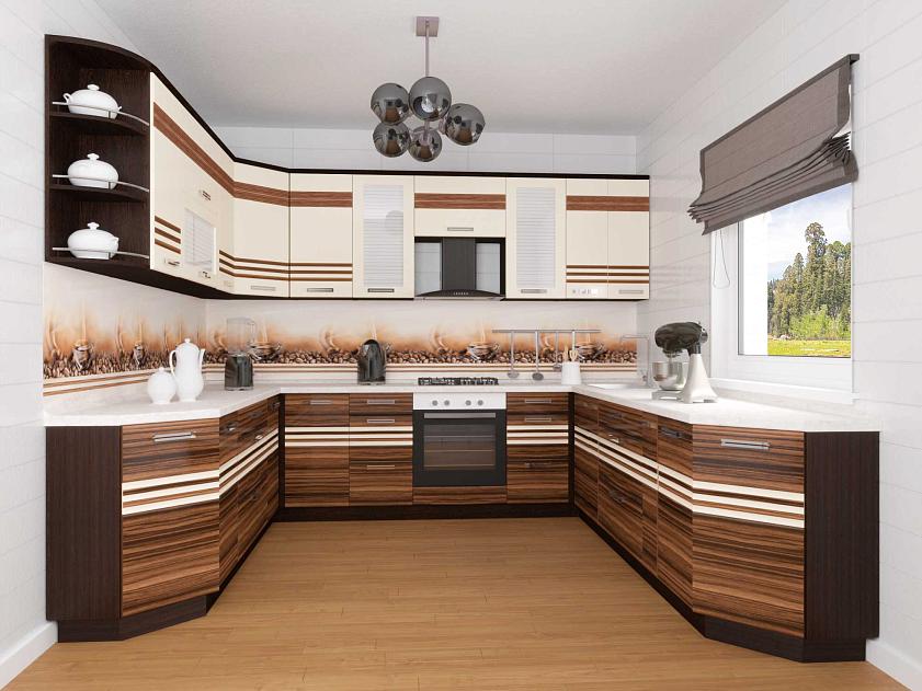 Набор мебели для кухни «Рио» выполнен в гармоничном сочетании цветов «Зебрано глянец» и «Жемчуг глянец». Модули украшены фрезеровкой и стеклянными вставками с рисунком. Оригинальные ручки подчеркивают современный дизайн.