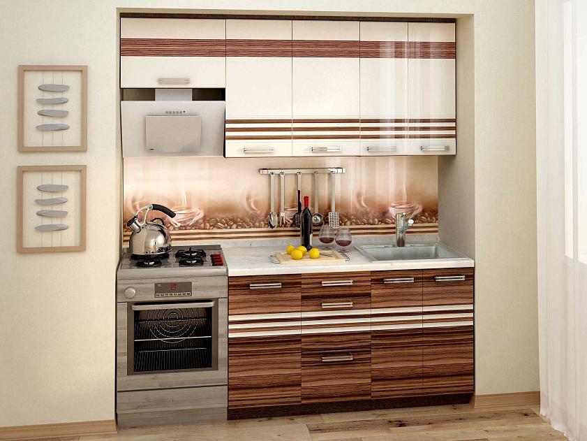 Набор мебели для кухни «Рио» выполнен в гармоничном сочетании цветов «Зебрано глянец» и «Жемчуг глянец». Модули украшены фрезеровкой и стеклянными вставками с рисунком. Оригинальные ручки подчеркивают современный дизайн.