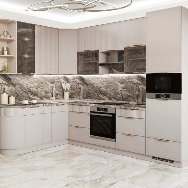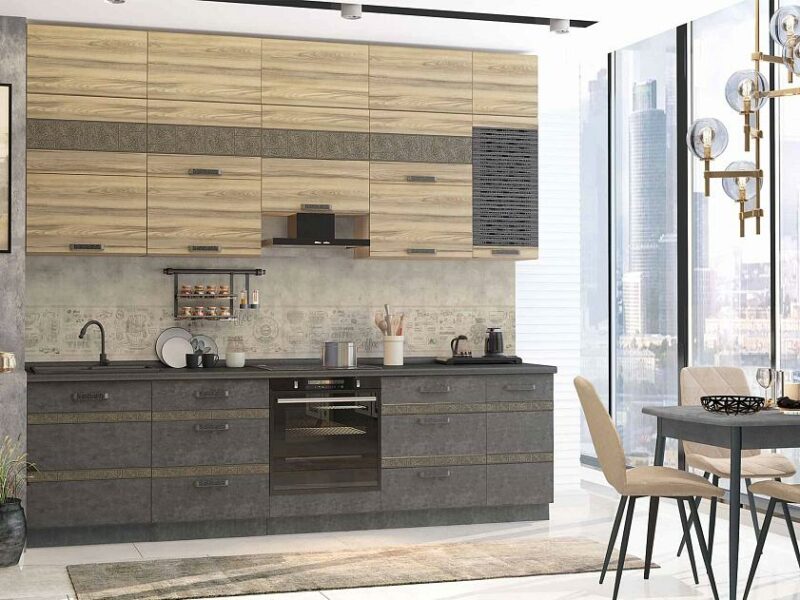 Модное цветовое сочетание, контрастные металлические ручки, декор, точно передающий фактуру натурального дерева как на ощупь, так и визуально, придают кухне выразительность и неповторимость.