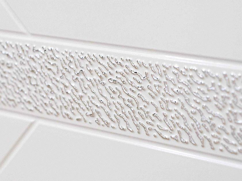 Привычная строгая геометрия кухонного фасада дополнена нежным 3D-декором в серебре.