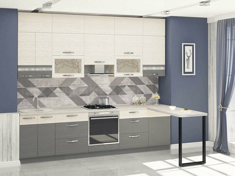 Ширина напольных шкафов с учетом свеса и размеров барной столешницы – 2900х1500 мм. Ширина навесных шкафов – 2900 мм.