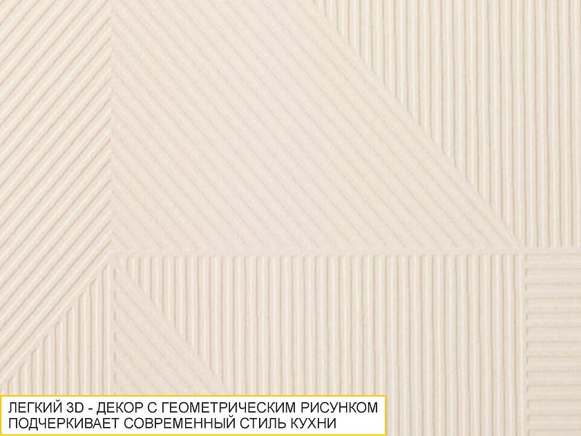 Легкий 3D-декор с геометричным рисунком на фасадах верхних шкафов подчеркивает современный стиль кухни,