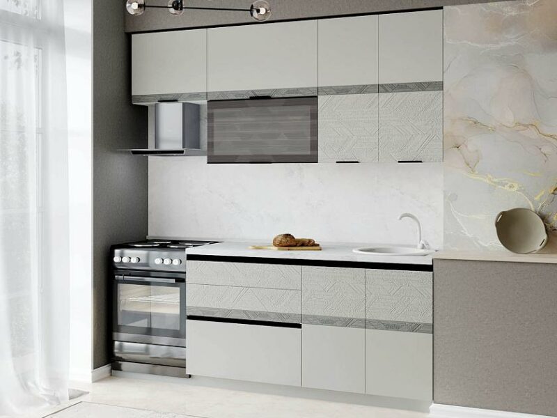 Объемное дизайнерское тиснение на фасадах подчеркивает современный стиль кухни.