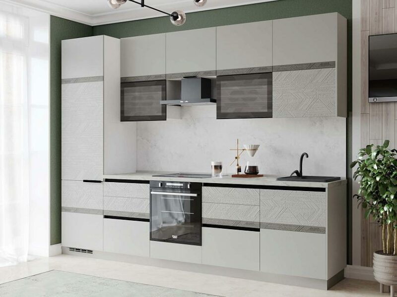 Объемное дизайнерское тиснение на фасадах подчеркивает современный стиль кухни.