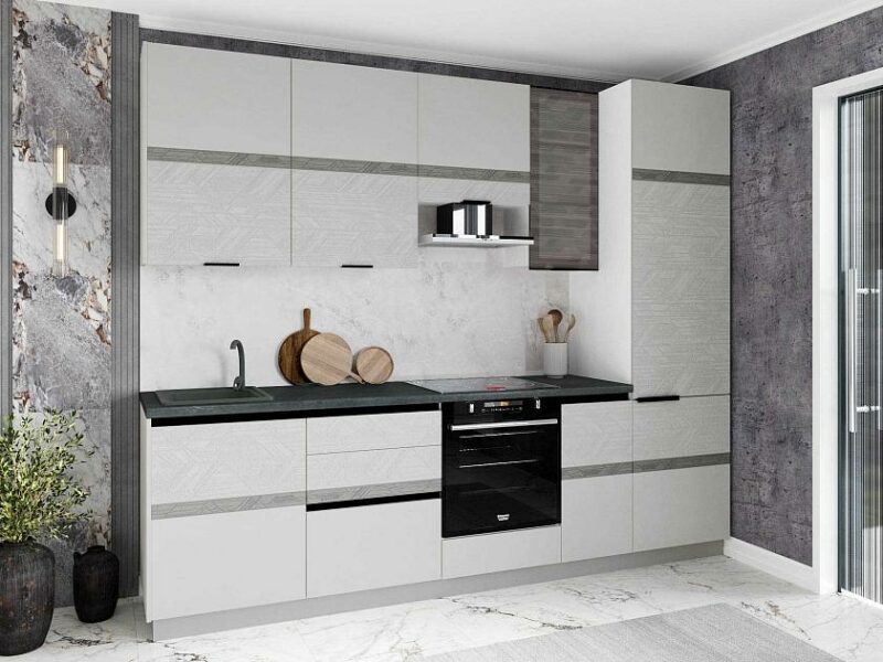 Объемное дизайнерское тиснение на фасадах подчеркивает современный стиль кухни.