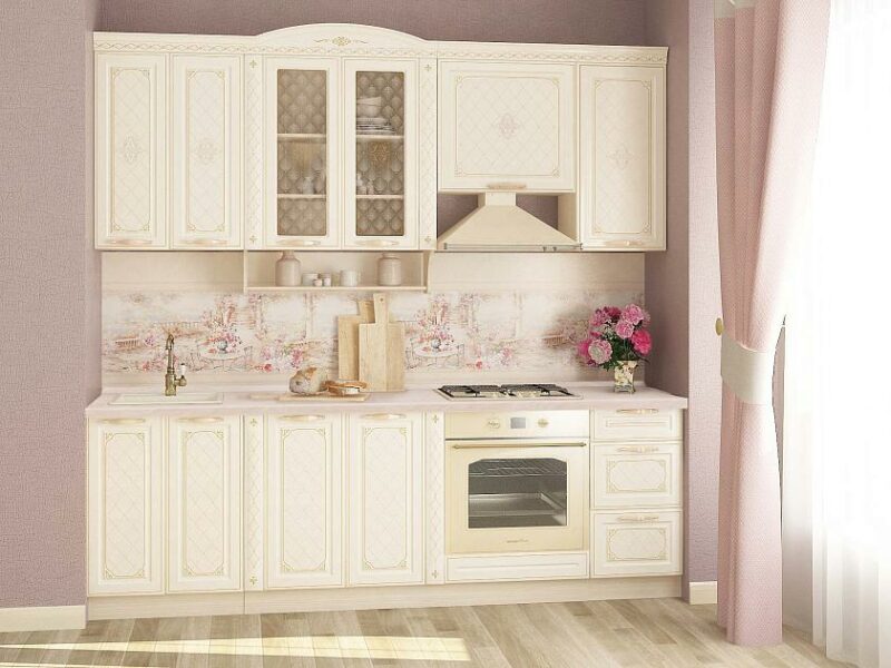 Набор мебели для кухни «Милана» — воплощение стиля и нежной роскоши. Ванильный цвет фасадов и изысканность декора очарует даже самого требовательного покупателя. Гармоничное сочетание светлого корпуса и фасадов зрительно увеличит пространство кухни.