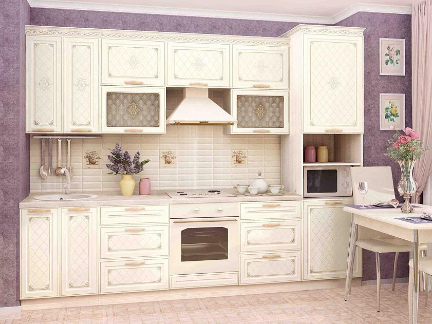 Набор мебели для кухни «Милана» — воплощение стиля и нежной роскоши. Ванильный цвет фасадов и изысканность декора очарует даже самого требовательного покупателя. Гармоничное сочетание светлого корпуса и фасадов зрительно увеличит пространство кухни.