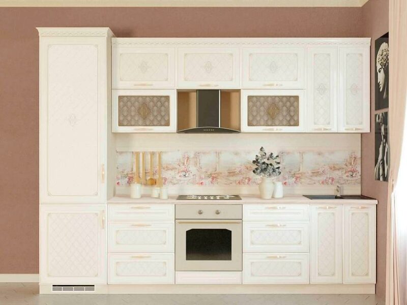 Нежный рисунок с 3D-эффектом на фасадах придаёт кухне легкость и изысканность, а рисунок патиной — благородство и дополнительный шарм.