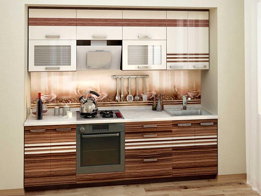 Набор мебели для кухни «Рио» выполнен в гармоничном сочетании цветов «Зебрано глянец» и «Жемчуг глянец». Модули украшены фрезеровкой и стеклянными вставками с рисунком. Оригинальные ручки подчеркивают современный дизайн.