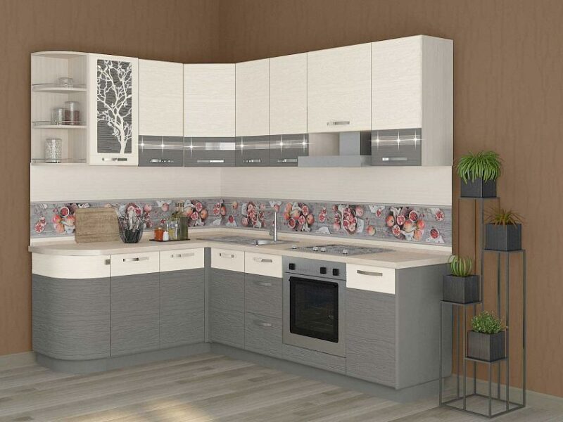 Оригинальный 3D-эффект на фасадах гармонично сочетается с дизайнерским рисунком витрин. «Графит» – кухня для тех, кто стремится быть в тренде и идти в ногу со временем! Ширина напольных шкафов с учетом рекомендуемого свеса столешницы – 1630х2420 мм. Ширина навесных шкафов с учетом навеса – 1610х2410 мм.
