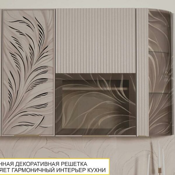 Легкий 3D-декор с геометричным рисунком на фасадах верхних шкафов подчеркивает современный стиль кухни,