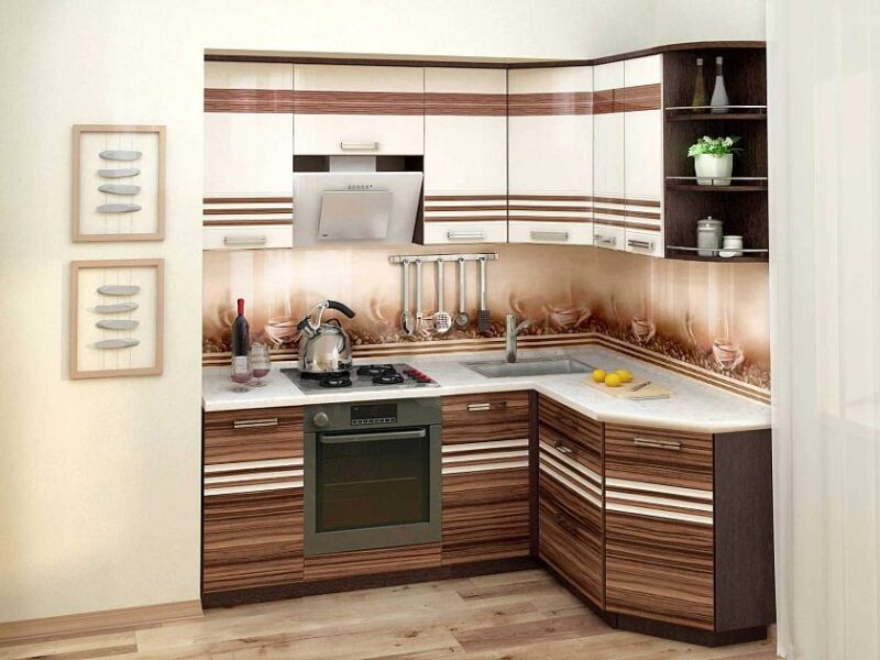 Набор мебели для кухни «Рио» выполнен в гармоничном сочетании цветов «Зебрано глянец» и «Жемчуг глянец». Модули украшены фрезеровкой и стеклянными вставками с рисунком. Оригинальные ручки подчеркивают современный дизайн.