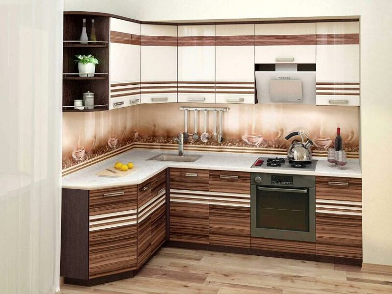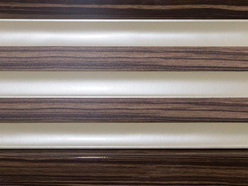 Набор мебели для кухни «Рио» выполнен в гармоничном сочетании цветов «Зебрано глянец» и «Жемчуг глянец». Модули украшены фрезеровкой и стеклянными вставками с рисунком. Оригинальные ручки подчеркивают современный дизайн.