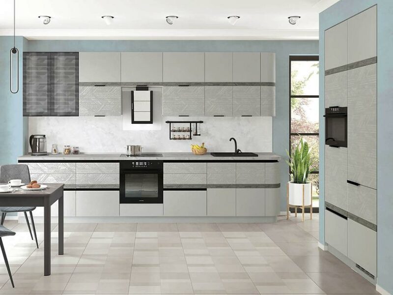 Объемное дизайнерское тиснение на фасадах подчеркивает современный стиль кухни.