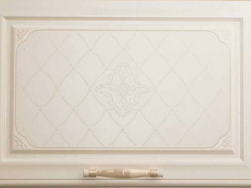 Нежный рисунок с 3D-эффектом на фасадах придаёт кухне легкость и изысканность, а рисунок патиной — благородство и дополнительный шарм.