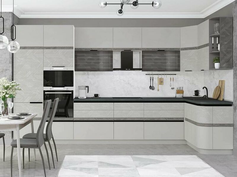 Объемное дизайнерское тиснение на фасадах подчеркивает современный стиль кухни. Рельефный рисунок придает оригинальный внешний вид.