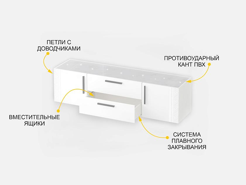 Топ тумбы выполнен из прочного осветленного стекла Crystal. Дизайнерский рисунок «мрамор» с утонченным мерцанием привлекает внимание и подчеркивает уникальность изделия.