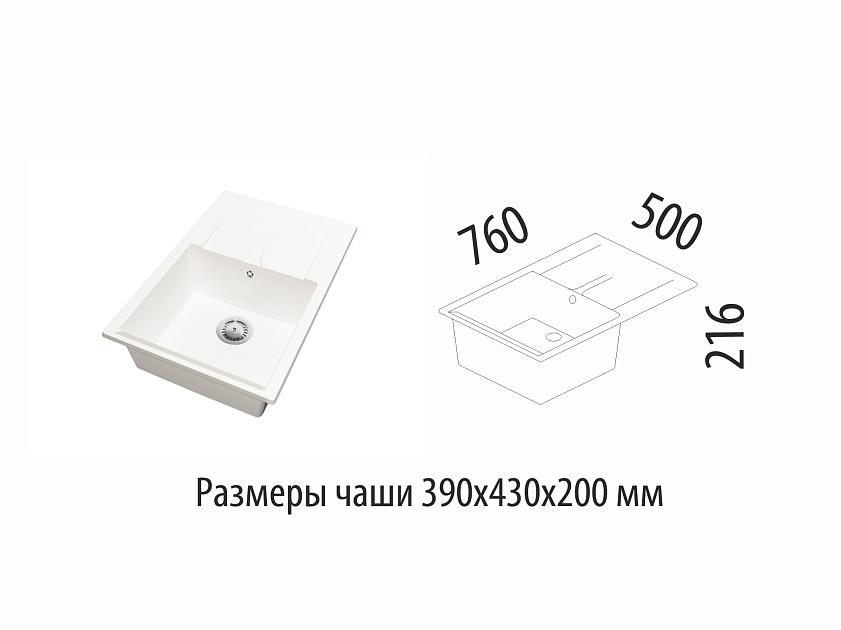 Размеры мойки — 760х500х216 мм, размеры чаши — 390х430х200 мм.