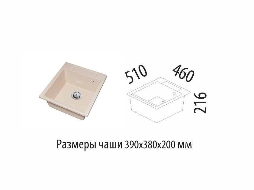 Размеры мойки — 460х510х216 мм, размеры чаши — 390х380х200 мм.