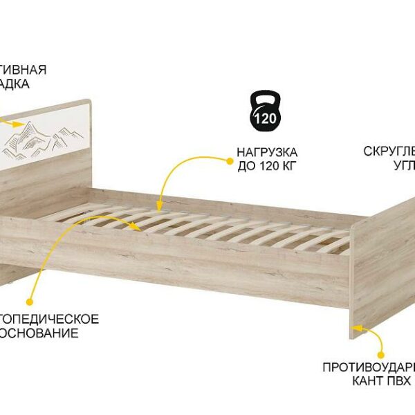Размер спального места – 90×200 см. Конструкция кровати выдерживает максимальную равномерно распределенную нагрузку до 120 кг.