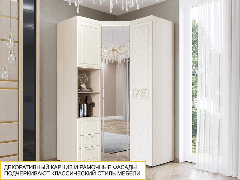 Шкаф оснащен штангой для хранения одежды на плечиках и полками, что позволяет организовать продуманную систему хранения. Зеркало в пол с аккуратной огранкой визуально увеличивает пространство и добавляет больше света.