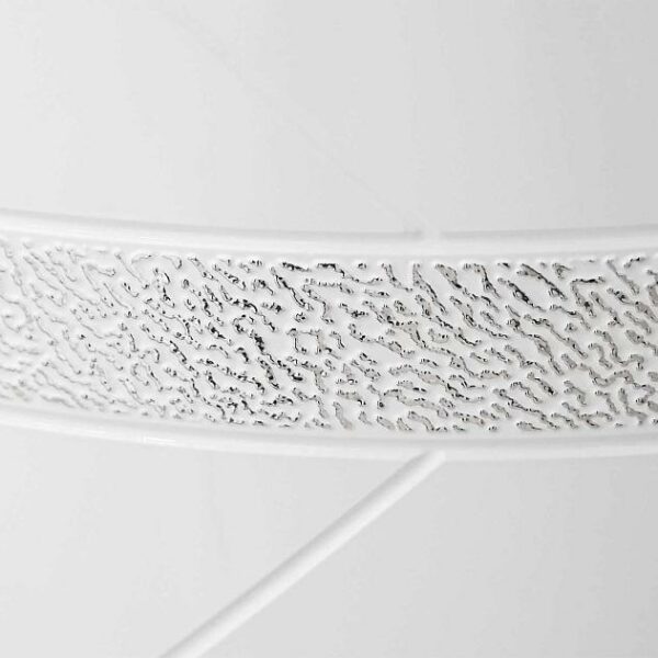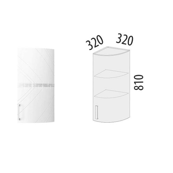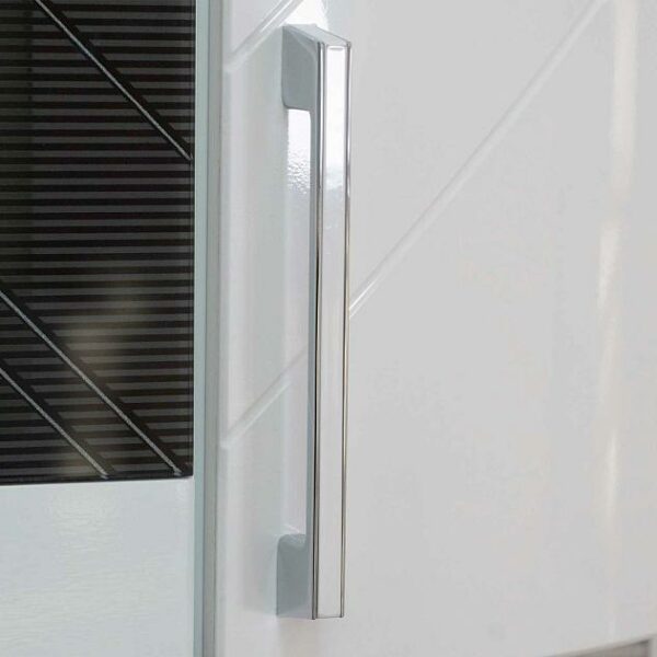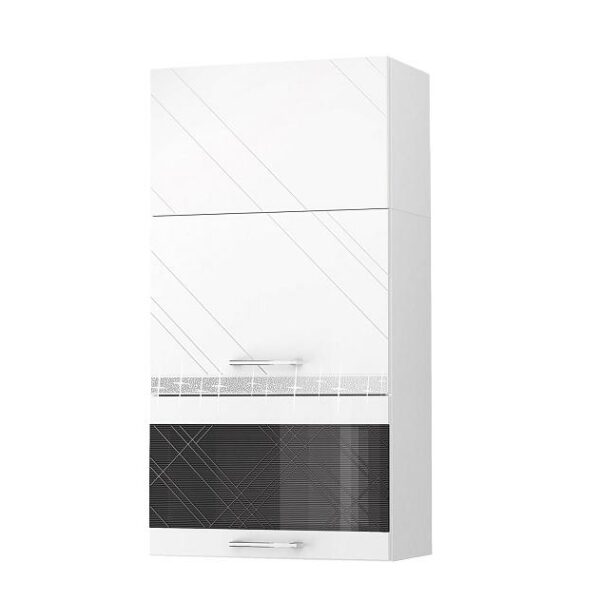 Привычная строгая геометрия глянцевого кухонного фасада дополнена нежным 3D-декором в серебре.