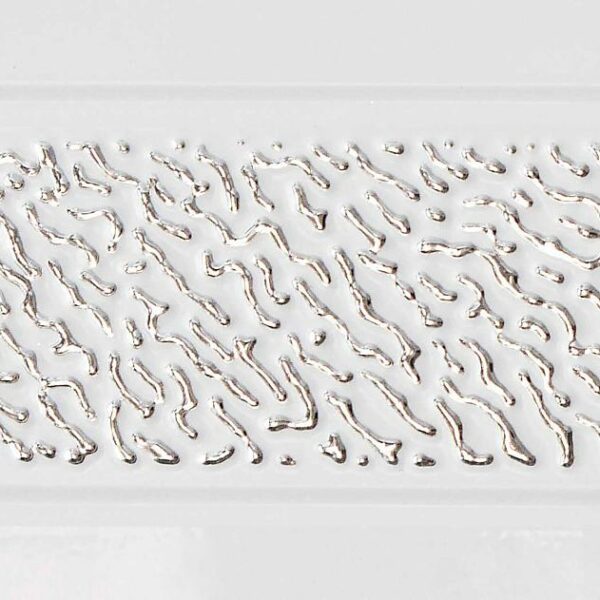 Привычная строгая геометрия глянцевого кухонного фасада дополнена нежным 3D-декором в серебре.