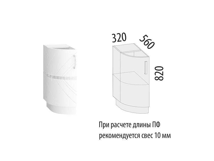 Радиусный модуль позволяет гармонично завершить композицию кухни. Плавное закрывание дверцы обеспечивается петлями с доводчиками. Дверца открывается влево. Ножки регулируются по высоте, что позволяет при