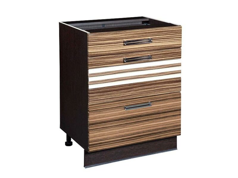 Напольный шкаф с тремя ящиками «Рио 16.66» входит в коллекцию мебели для кухни «Рио». Модель украшена фрезеровкой с рисунком. Оригинальные ручки подчеркивают современный дизайн.