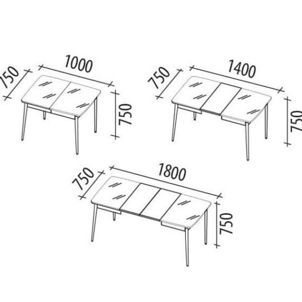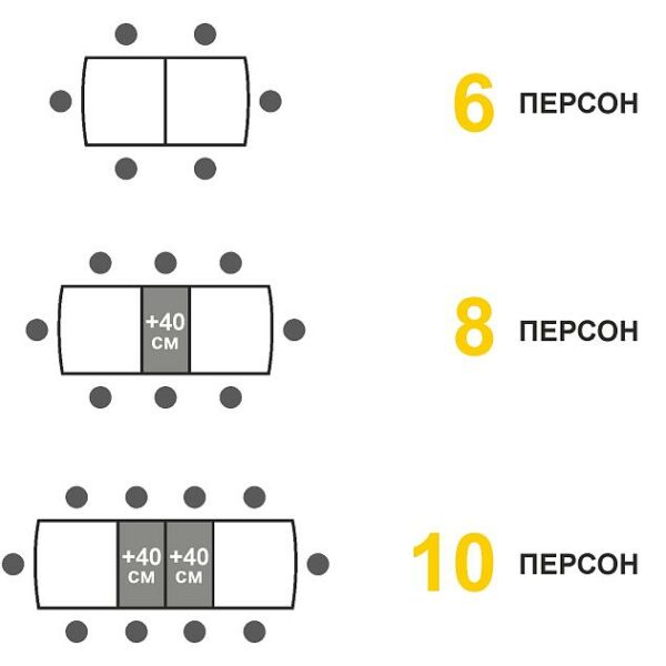 Механизм «Раздвижение и две вставки» позволяет увеличить ширину столешницы. При раскладывании стола вставки соединяются скрытыми замками фиксации, что придает дополнительную жесткость конструкции. В сложенном виде размер стола – 120х75 см, в разложенном – 160х75 см (с одной вставкой), 200х75 см (с двумя вставками); высота стола – 76 см. Максимальное количество посадочных мест за столом – 10 персон (при ширине стула – 45 см).