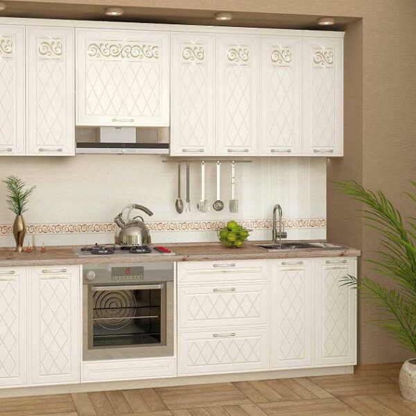 Фасад выполнен из МДФ толщиной 16 мм, облицован пленкой ПВХ европейского производителя. Крепежные планки выполнены из ЛДСП толщиной 16 мм.